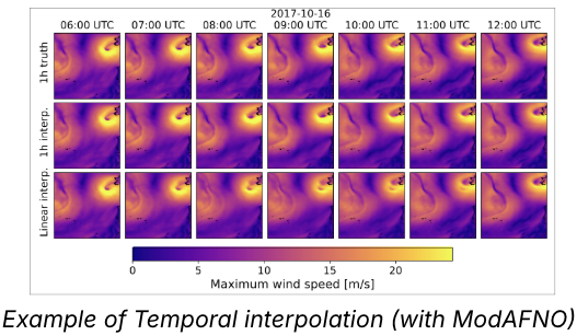ChronoWeather (physics-guided temporal interpolation) — recover T+1…T+5 from only T and T+6 via endpoint-conditioned interpolation. We use ModAFNO baseline as the primary time-conditioned spectral operator, with alternatives based on continuous-time latent dynamics (Neural ODE/CDE) and flow matching bridges. The study combines endpoint conditioning with physics constraints (mass/energy/moisture budgets, advection/divergence) to improve extremes and cross-variable coherence; applications include cadence upsampling for nowcasting, denser timelines for assimilation, and lower error when stepping down from 6-hour synoptic cycles to hourly forecasts.